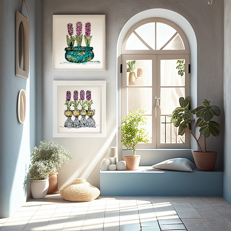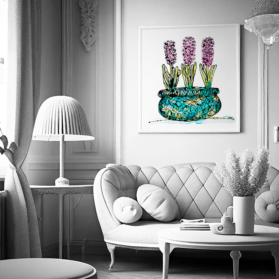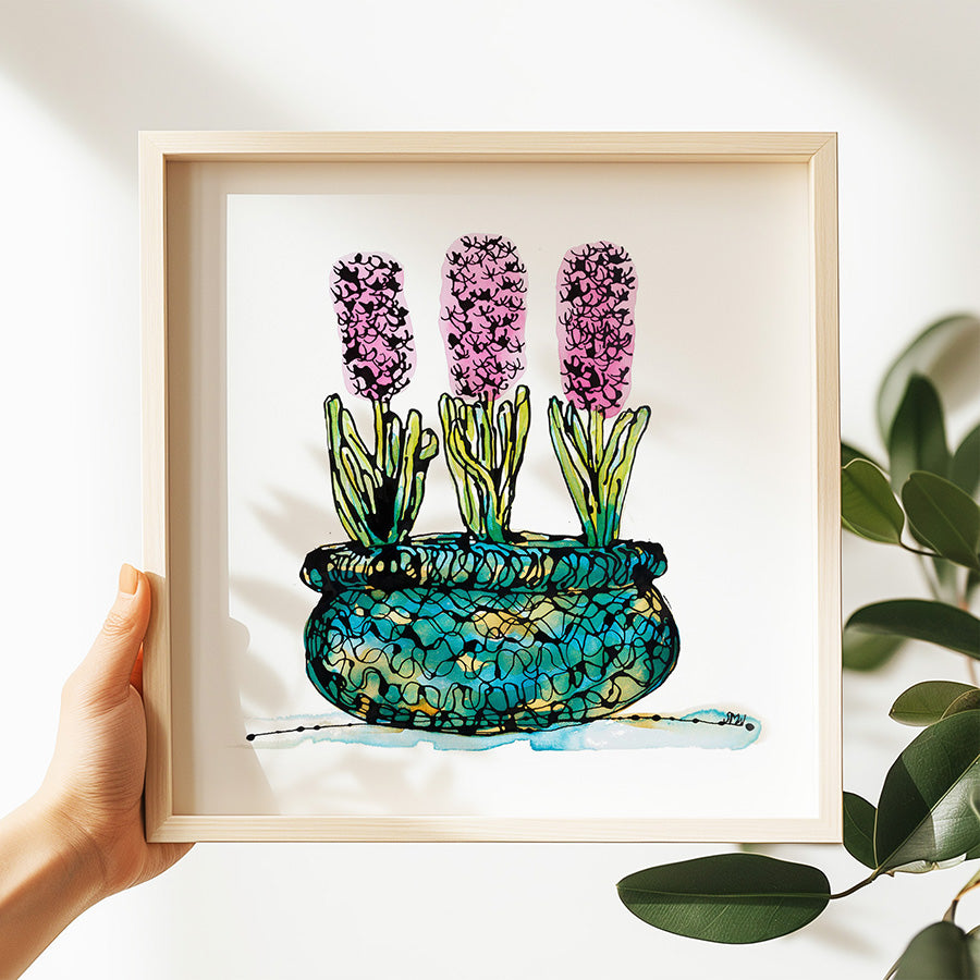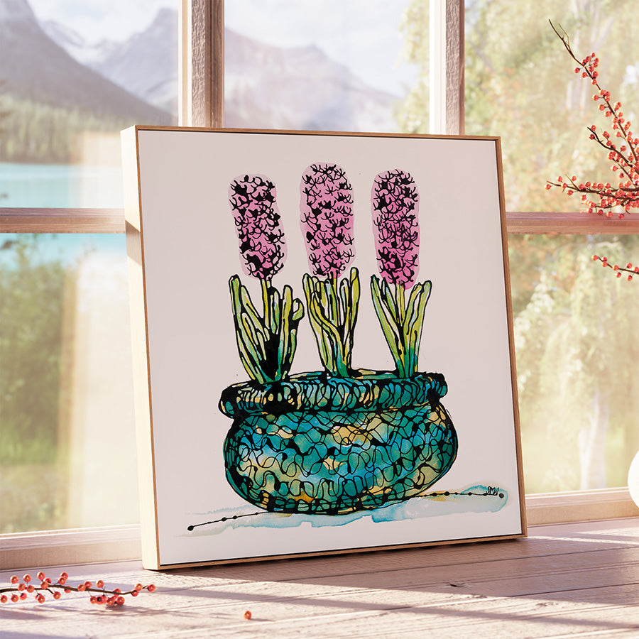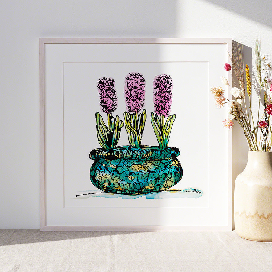 PINK HYACINTHS IN A RICH BLUE BASKET floral art print